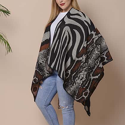 Stripes, Polka Dot and Snake Skin Pattern Ruana with Border (Size 75x135 Cm) - Black, Brown and Grey