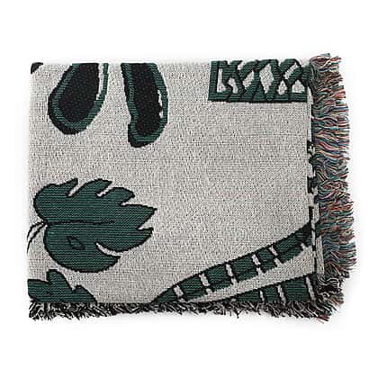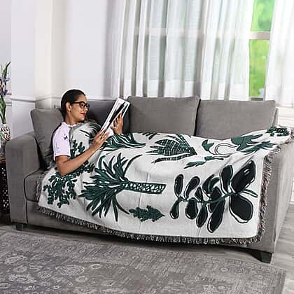 Jacquard Woven Palm Tree Printed Throw with Fringes (Size 150x126 Cm ) - Green & Ivory