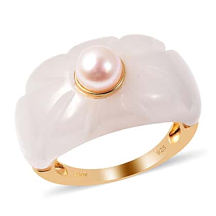 Japanese Akoya Pearl and White Jade Floral Ring in Yellow Gold Plated Sterling Silver