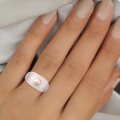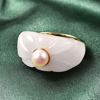 Japanese Akoya Pearl and White Jade Floral Ring in Yellow Gold Overlay Sterling Silver