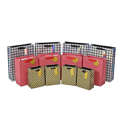 Set of 12 Eco Friendly Gift Bags with Gold Foiling Prints for All Occasions (Size - Lx4-Multi, Mx4-Red, Sx4 - Gold)