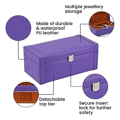 This jewellery box is made of PU, which lends it a classy leather finish. The box is designed to store your precious jewels and ornaments for everyday use. It has a 2-tier storage compartment with multiple sections for different items. The box is lightweight and sleek. It is portable and can be carried on journeys. The magnetic lock completes the minimalist design of the box.