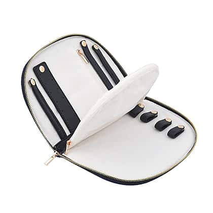 - Features earring holder, necklace hooks, ring roll, zipper pockets