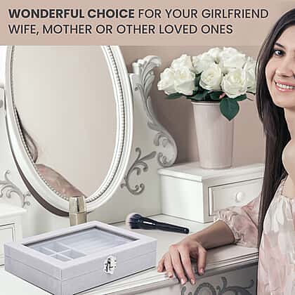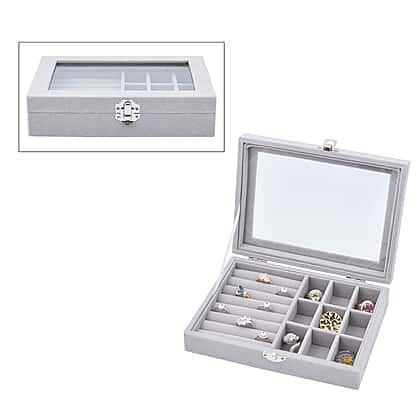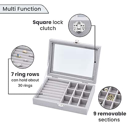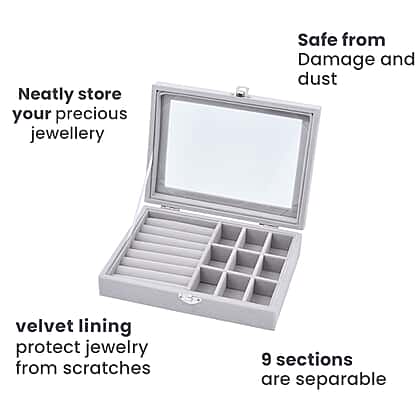 Velvet Jewellery Box- Ring - 9 Sections Box, Glass Window with Steel Colour Lock (Size20x15x4 Cm) - Grey