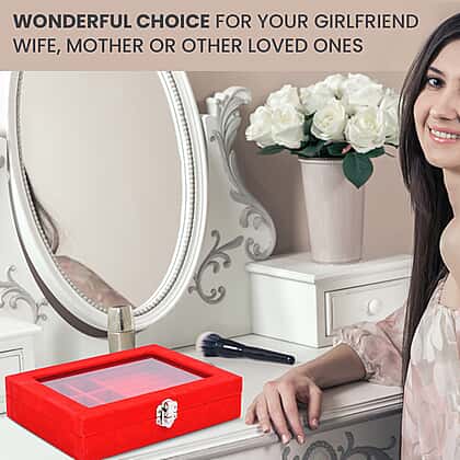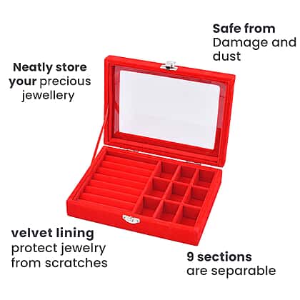 Velvet Jewellery Box- Ring - 9 Sections Box, Glass Window with Steel Colour Lock (Size20x15x4 Cm) - Red