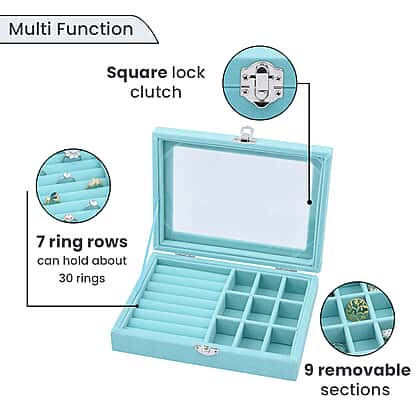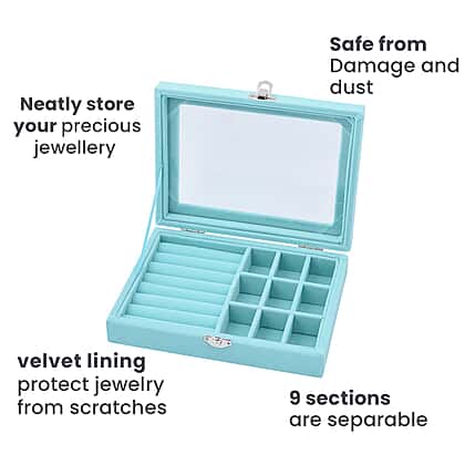 Velvet Jewellery Box- Ring - 9 Sections Box, Glass Window with Steel Colour Lock (Size 20x15x4 cm) - Sky Blue