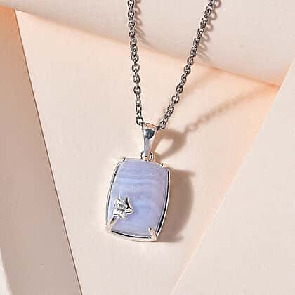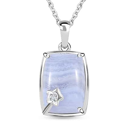 Blue Lace Agate and Natural Zircon Sterling Silver Pendant with Chain (Size 20)