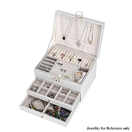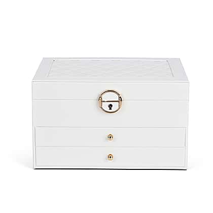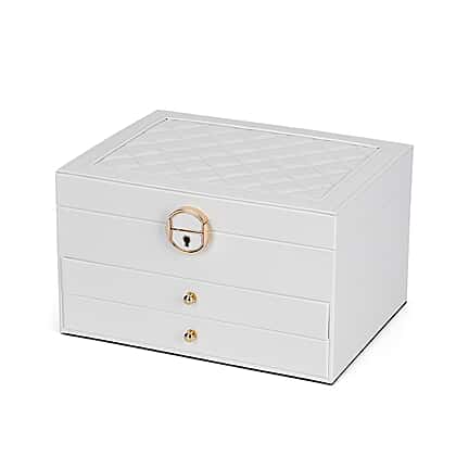 Organise your treasures in this beautifully designed 3-layer jewellery box featuring a luxurious quilted PU leather exterior. Compact yet spacious, its interior provides dedicated compartments for necklaces, earrings, rings, and bracelets, ensuring your valuables are neatly stored and protected. The key-lock closure offers added security, while the soft velvet-lined interior safeguards against scratches. With its sophisticated diamond-patterned finish, this jewellery box is practical and a stunning addition to your dressing table. It is perfect for personal use or gifting on special occasions.