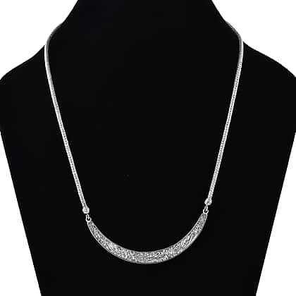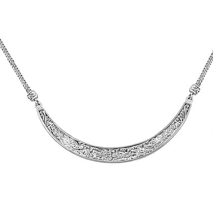 Timeless craftsmanship defines the sterling silver filigree pattern necklace, a piece that adds effortless refinement to any look. The intricate filigree detailing across the curved centrepiece captures a delicate lace-like finish, blending artistry with elegance. Fashioned from 925 sterling silver, it’s hypoallergenic, comfortable, and designed to remain radiant for years. A 20-inch chain ensures it sits beautifully at the collarbone, secured with a polished T-bar clasp for ease. Ideal for layering with minimalist chains or wearing as a statement, this necklace is an instant wardrobe classic that elevates both casual and formal dressing.