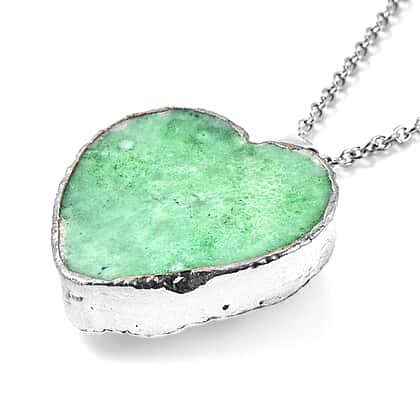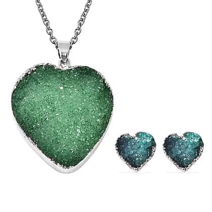 2 Piece Set Green Druzy Quartz Heart Stud Earrings and Pendant with Chain in Silver Tone 20 Inches