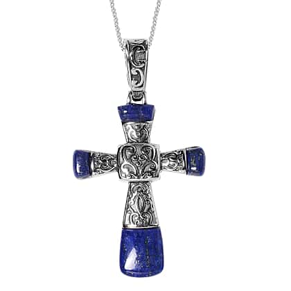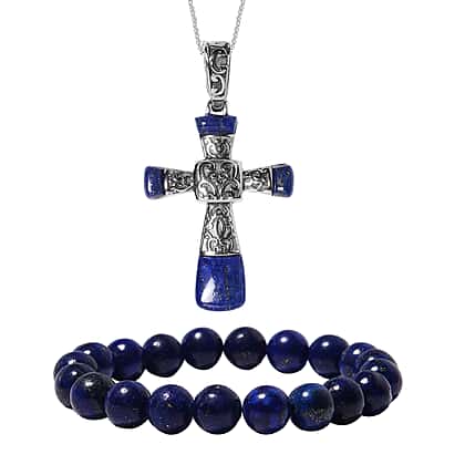 2 Piece Set - Lapis Lazuli Stretchable Bracelet (Size 7) and Cross Pendant with Chain (Size 20) 130.25 Ct