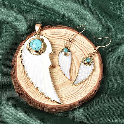 The set comes with a pendant, and a pair of earrings is crafted with White Shell pearl in Angel Wings shaped embellished with Blue Howlite. The pendant has a yellow gold outline of the shape. Blue Howlite is made up by dyeing White howlite in a blue hue. The gemstone is well known as a healing stone. The pendant's surface is crafted from White Shell Pearl, also known as Mother of Pearl, as it is made from the inner lining of oyster shells.