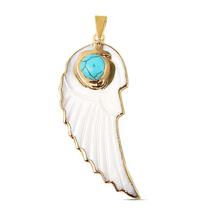 2 Piece Set - Blue Howlite and White Shell Pearl Angel Wing Pendant with Chain (Size 24 with 2 inch Extender) & Hook Earrings in Yellow Gold Tone