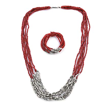2 Piece Set Coral and Silver Colour Beaded Multi Strand Necklace and Bracelet 15.5 With 7 Inch