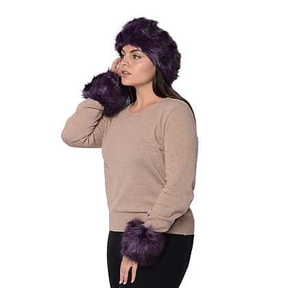 2 Piece Set Faux Fur Headband Size 10.2x55.9 Cm and Wrist Warmer in Dark Purple Colour Size 10.2x20.3 Cm