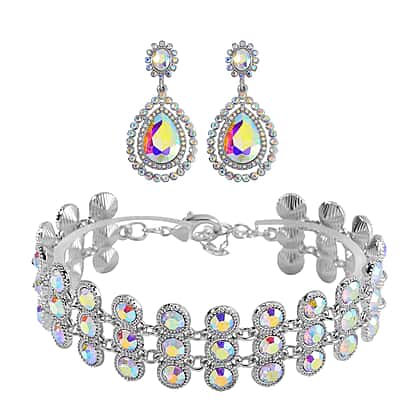 2 Piece Set - Mystic White Austrian Crystal Bracelet (Size 7.5-2) and Dangle Earrings