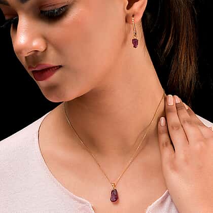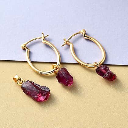 2 Piece Set Raw Rhodolite Garnet January Birthstone Hoop Earrings and Pendant in Gold Plated Sterling Silver