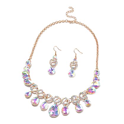 2 Piece Set - Simulated Mercury Mystic Topaz and Simulated White Mystic Crystal Necklace (Size 20 with 2 inch Extender) and Hook Earrings in Gold Tone