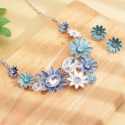 2 Piece Set - White Austrian Crystal and Simulated Diamond Floral Necklace (Size - 20 With 2 Inch Extender) and Earrings (With Push Back) with Enamelled in Silver Tone