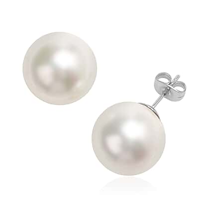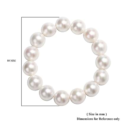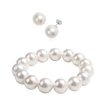 2 Piece Set White Shell Pearl Beaded Stretchable Bracelet 7 Inch with Earrings in Rhodium Plated Sterling Silver