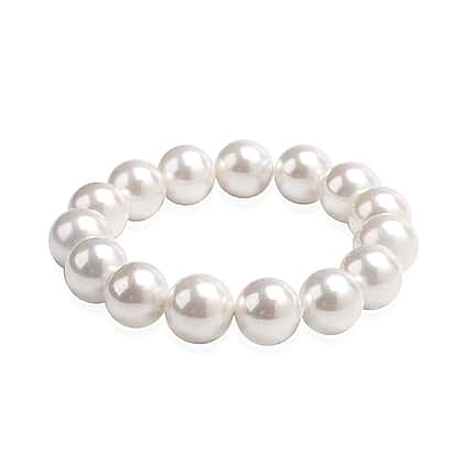 2 Piece Set - White Shell Pearl Beaded Stretchable Bracelet (Size 7) and Earrings (with Push Back) in Rhodium Overlay Sterling Silver