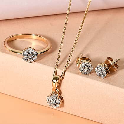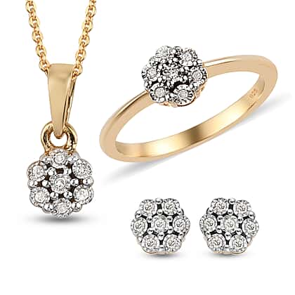 3 Piece Set - Diamond Ring, Pendant with Chain (Size 20) and Stud Earrings (with Push Back) in 14K Gold Overlay Sterling Silver 0.18 Ct, Silver Wt. 6.24 Gms