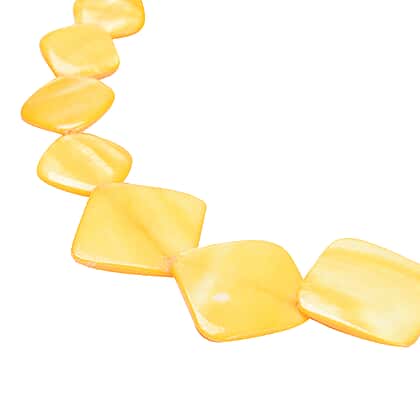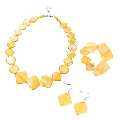 - The flattened square-cut beads of gold shell give the set an eye-popping look