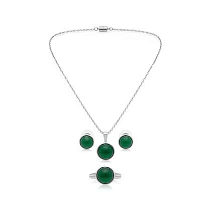 This 3-piece set featuring green onyx earrings, ring, and pendant with Chain offers a bold and striking look. The set, designed with lush green onyx stones, is crafted in silver-tone metal to enhance its vibrant hue. The earrings feature a push-back closure, while the ring and pendant offer a harmonious match, making this set perfect for adding a touch of nature-inspired luxury to your jewellery collection. Ideal for both casual and formal occasions, this set not only adds beauty but also uplift your fashion game.