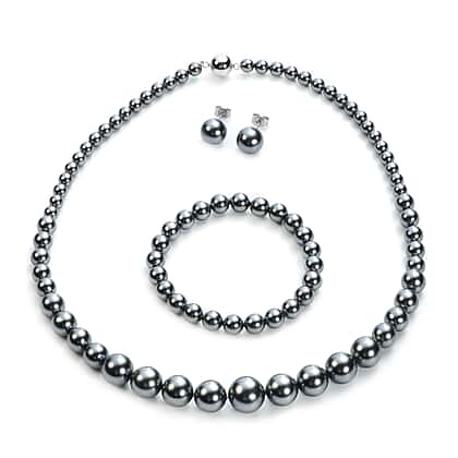 3 Piece Set Peacock Shell Pearl Stretchable Bracelet 7 Inches, Necklace 20 Inches and Earrings in Silver Tone