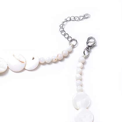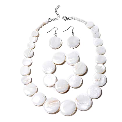 3 Piece Set - White Shell Necklace (Size 18 with 2 inch Extender), Stretchable Bracelet (Size 7) and Hook Earrings in Stainless Steel