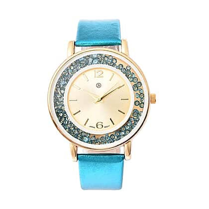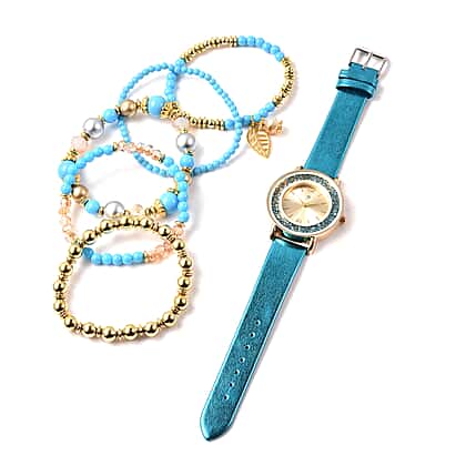 6 Piece Set - STRADA Japanese Movement Moving Blue Austrian Crystal Water Resistant Watch with Blue Strap and Set of 5 Adjustable Bracelet (Size 6.5-7.5) in Gold Tone