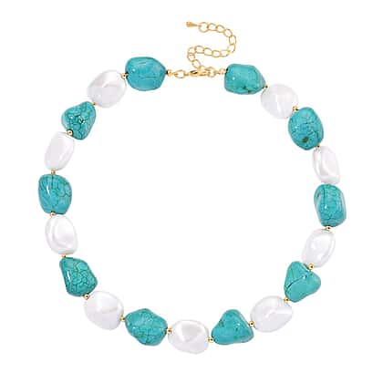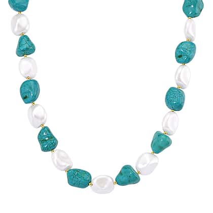 - Crafted with blue howlite and glossy white shell pearls.