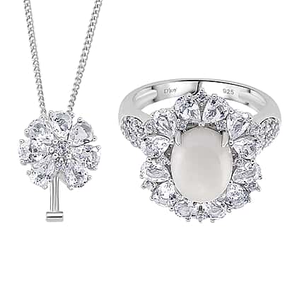 D'Joy White Jade & White Topaz Pendent with Chain (Size 18) & Ring in Rhodium Overlay Sterling Silver 6.81 Ct, Silver Wt. 8.55 Gms.
