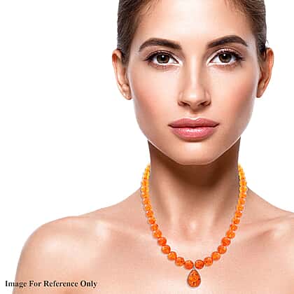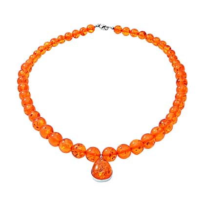 The fiery hues of a rare stone make this designer-inspired Baltic amber beads necklace a distinctive piece. The pendant and clasp are crafted in 3 grams of sterling silver with a rhodium overlay, while the necklace is made of 8-12mm amber balls. A pear-shaped amber bead in a cabochon cut (22x16mm) holds centre stage in the pendant. Total weight of the amber beads in the necklace is 159 Carat.