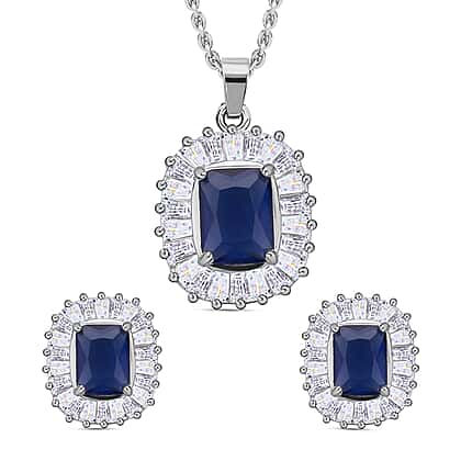 Set of 2 - Simulated Diamond and Simulated Blue Sapphire Pendant with Chain (Size - 20 with 2 Inch Extener) and Earrings (With Silicon Push Back) in Silver Tone