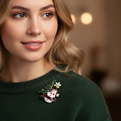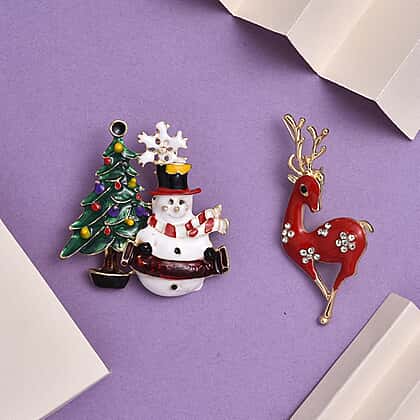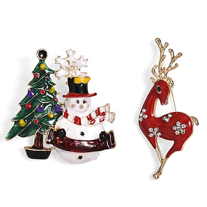 Set of 2 - White & Black Crystal Christmas Celebrations Brooch in Yellow Gold Tone with Enameled