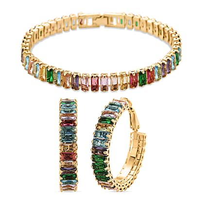 Add colour and detail to your jewellery collection with this coordinated bracelet and earring set, designed to create a lively and balanced look. The tennis bracelet features a sequence of green, blue and multicolour cubic zirconia stones, arranged to form a continuous line of colour across the wrist. The matching earrings complement the design, offering a consistent and well paired appearance. Finished in a gold tone, the set enhances the vibrancy of the stones while maintaining a polished and wearable look suitable for both everyday styling and occasions.