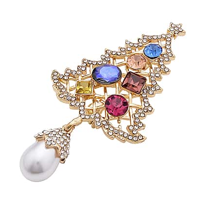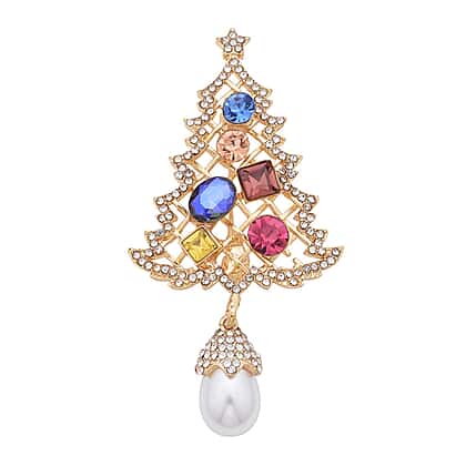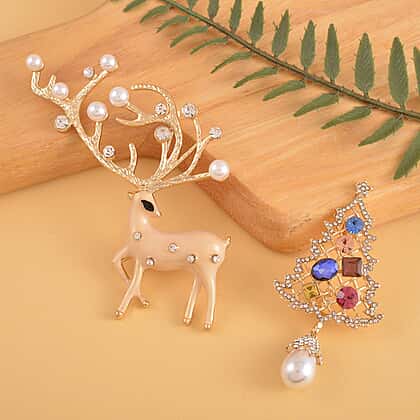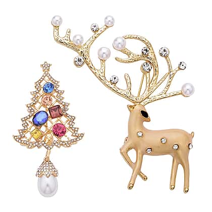 Set of 2 - Simulated Pearl and Multi Colour Austrian Crystal Reindeer and Christmas Tree Brooch in Yellow Gold Tone.