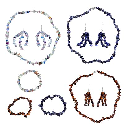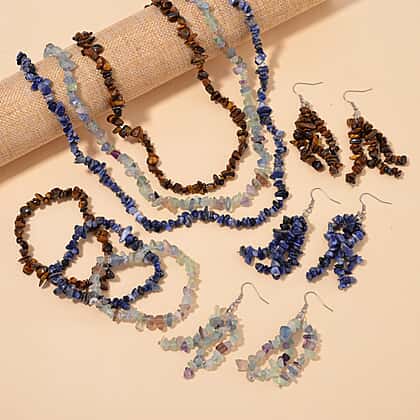 Set of 9 Pcs - Tigers Eye, Sodalite & Fluorite Necklace (Size - 20), Bracelet (Size - 7.5) Stretchable & Hook Earrings in White Tone 1090.00 Ct.