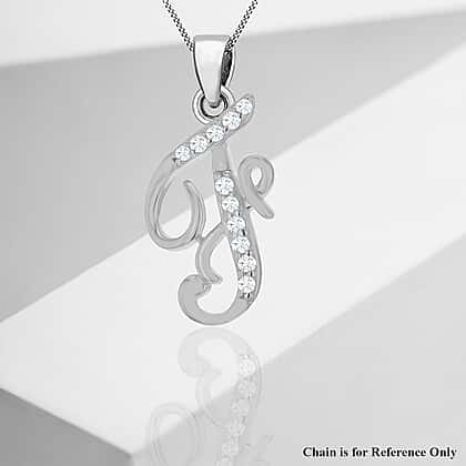 F Initial Pendant in Script Font in Sterling Silver Rhodium Plated Cubic Zirconia 9mm x 19mm
