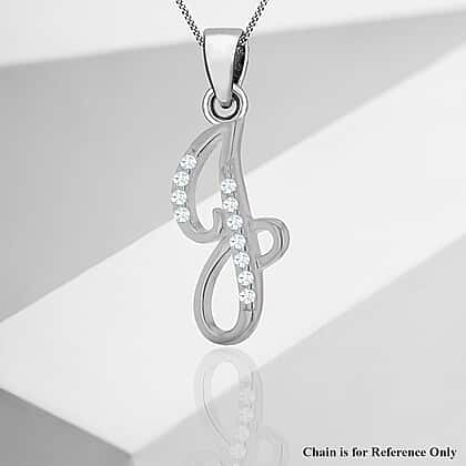J Initial Pendant in Script Font in Sterling Silver Rhodium Plated Cubic Zirconia 7.5mm x 19mm