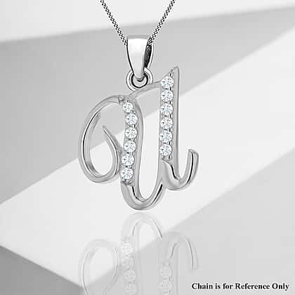 U Initial Pendant in Script Font in Sterling Silver Rhodium Plated Cubic Zirconia 13.5mm 18.5mm