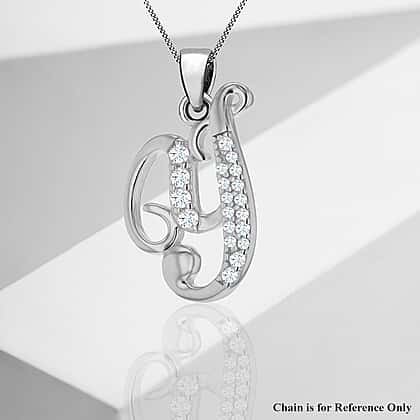 Y Initial Pendant in Script Font in Sterling Silver Rhodium Plated Cubic Zirconia 11mm x 19mm