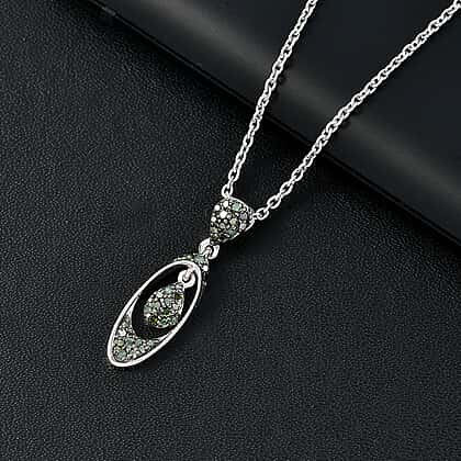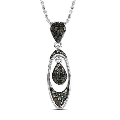 Infuse your look with nature-inspired charm through this green diamond pendant in rhodium-coated sterling silver. The eye-catching teardrop is set with rich green diamonds, suspended within a shimmering oval silhouette. Designed from hypoallergenic, tarnish-resistant 925 sterling silver, it provides lasting comfort and brilliant shine. The 20-inch chain adds grace and versatility, ideal for layering or solo wear. Green diamonds are known for their earthy elegance and distinct hue, adding intrigue and timeless flair to this striking design.