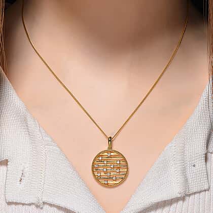 It's contemporary, it's edgy, and can add glamour to any ensemble! We are talking about the set of two identical circular style moissanite pendants. Crafted in yellow gold plated sterling silver, the circular frame of the charm is embellished with tiny round moissanites. The charm further features well-spaced horizontal bars encrusted with round moissanite stones, set in classic four-prong setting. It has a geometric feel and luxe edge. Well, if you are looking for one ultra-modern piece that is sure going to be a conversation starter, then rejoice! You have just found one. The design creates a balanced look by mixing linear and circular designs, the warm gold-tone further adds a soft glow to it. All in all, this is just the moissanite pendant with a chain that you need to add an unexpected touch to your everyday dressing.
