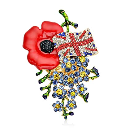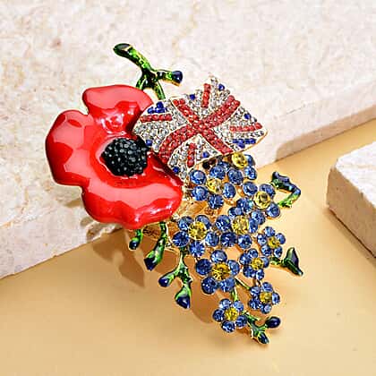 Multi Colour Austrian Crystal Enameled Poppy Design Brooch in Yellow Gold Tone