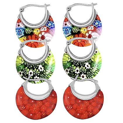 Set of 3 - Multi Colour, Green and Red Murano Style Basket Earrings in Stainless Steel