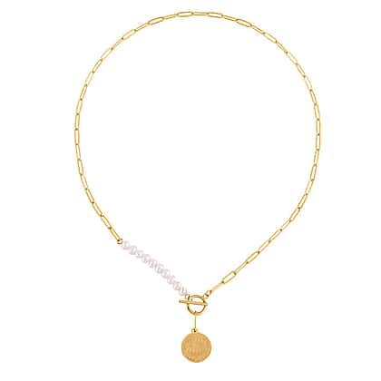 Like a string of moonlit pearls, this necklace marries the gentle lustre of white freshwater pearls with the boldness of a yellow gold-toned paperclip chain. The circular design symbolizes infinity and completeness, making this piece a metaphor for life's unending journey. It’s a celebration of elegance and continuity, perfect for those who seek jewellery that tells a story. This necklace is not just an accessory; it's a tribute to the timeless beauty of pearls and the enduring strength of gold.