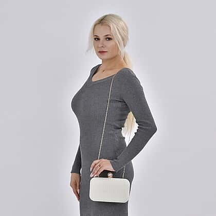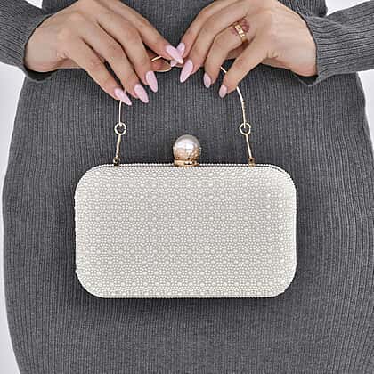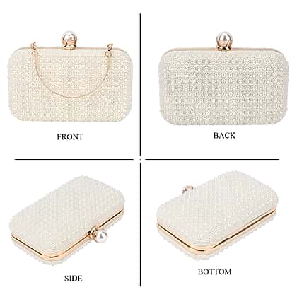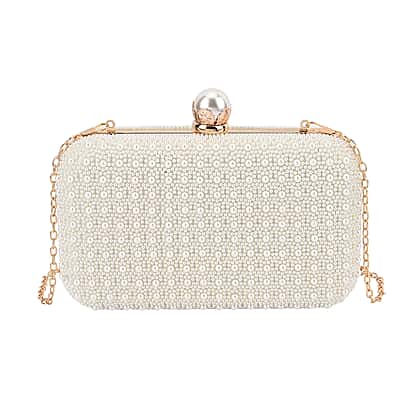 Closeout Deal - Imitation Pearl Embellished Evening Clutch with Chain Strap - White