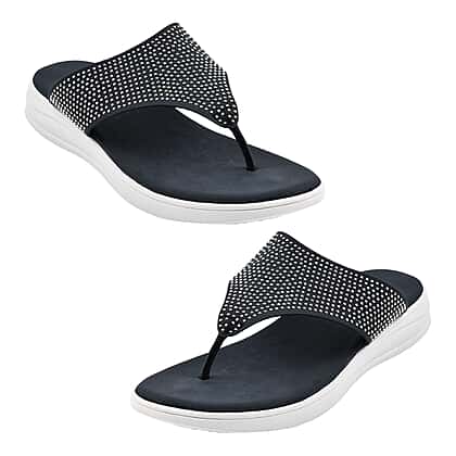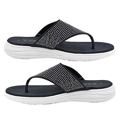 Step out in style with the JO & JOE ladies sandal with diamante detail, 'Lady.' Exclusively part of the JO & JOE Collection, this toe-post sandal showcases an abundance of glamour. Adorned with stunning diamante jewels on the front, it features a subtle wedge heel that combines elegance with comfort. The 'Lady' sandal is designed to complement any outfit, making it a versatile choice for all your summer occasions. Lightweight and equipped with a cushioned insole, it promises all-day comfort while adding a touch of sparkle to your steps.